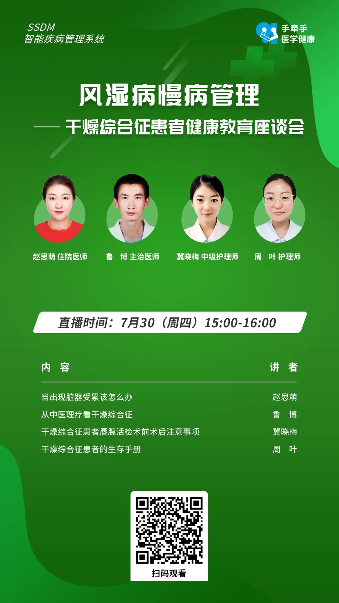 为在疫情常态化防控工作中更好的帮助干燥综合征患者进行自我疾病管理,7月30日,我院风湿免疫科在示教室举办了“风湿病慢病管理—线上干燥综合征患者健康教育座谈会”。座谈会通过网络直播形式进行,共41名患者在线上进行了健康咨询和病情交流。
