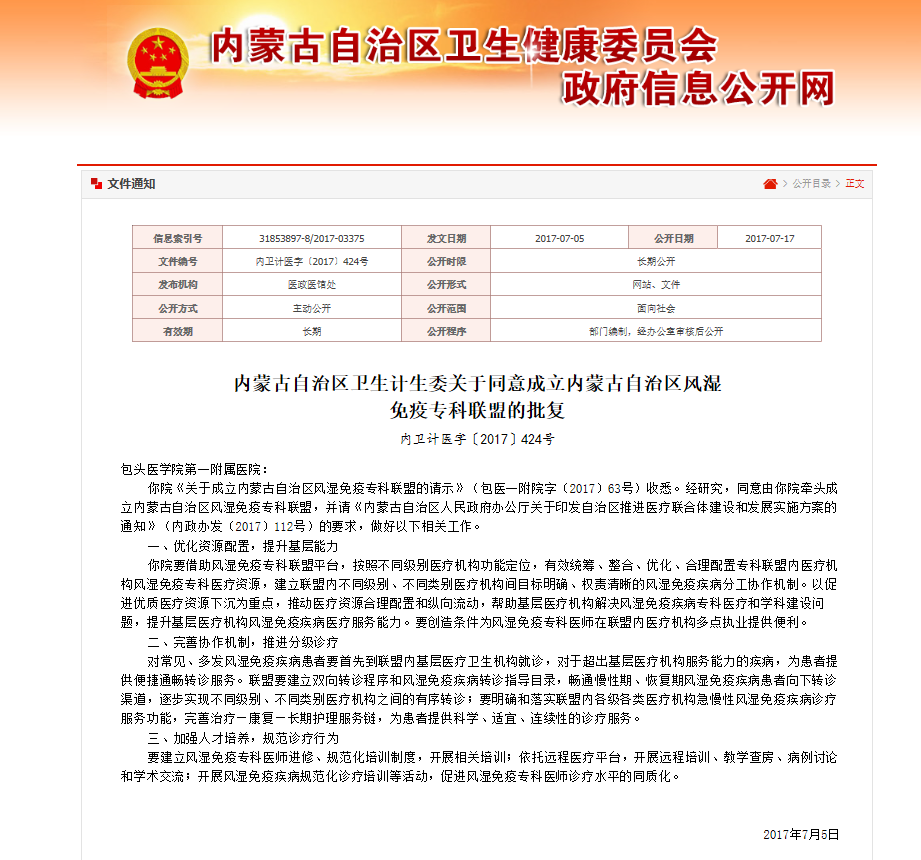 内蒙古自治区风湿免疫专科联盟经自治区卫生健康委审批,由我院牵头汇集全区70家医院力量于2017年成立。随着人民群众生活水平的提高,高尿酸血症和痛风发病率不断升高,初步估计,包头市有近40万高尿酸血症患者和3万多痛风患者,为了让患者获得长期缓解,内蒙古自治区风湿免疫专科联盟在包头市九原区蒙医中医医院设立包头市高尿酸血症与痛风慢病管理培训基地。