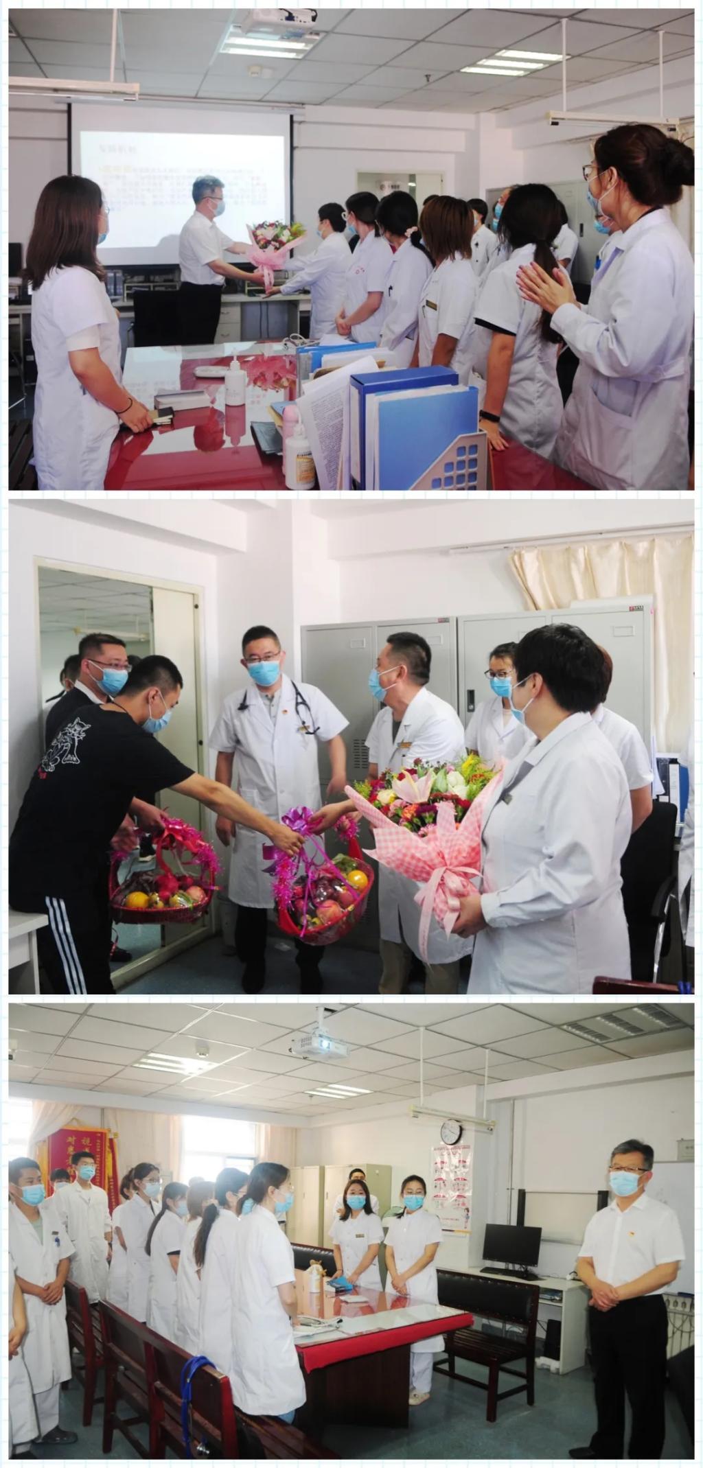 2020年8月19日是第三个“中国医师节”,今年医师节的主题是“弘扬抗疫精神,护佑人民健康”。8月19日上午,我院党委书记石继海,党委副书记、院长王秋枫,党委委员、副院长于跃利、裴汉军、张昕,党委委员、纪委书记白苏和,党委委员、院长助理赵紫罡和相关科室主任、负责人一起,为医师代表送上鲜花和祝福。