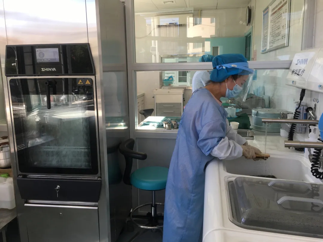 在包头医学院口腔医院(包医一附院口腔科)二楼一侧,器械处理室和灭菌室的消毒工作有条不紊的进行中,全院口腔使用的所有医疗器械,都要从这里发放和回收。穿着防水衣、戴着无菌手套“全副武装”的护士们每天都要负责对所有重复使用的医疗器械,进行分类、清洗、消毒、干燥,每一个工序都精益求精。全自动清洗消毒机、口腔专用脉动真空灭菌器,过氧化氢等离子灭菌器等先进的设备,在患者看不到的角落,国际一流的消毒设备不间断地进行着精密器材及所有物品的清洗消毒工作,为患者就医安全提供全方位保障。