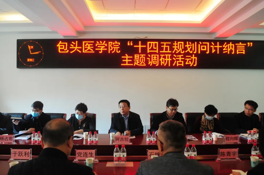 2020年11月11日,包头医学院党委副书记、校长阿古拉在包头医学院党政办公室主任王忠、发展规划处处长陈永利、教务处处长程向晖、科研处处长杨占君、人事处处长周成江、招生就业处处长张东升、研究生院副院长赵洪英和学生处副处长史欢洁的陪同下到我院开展调研督导工作。
