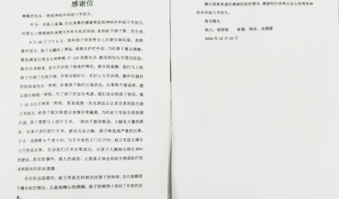 12月10日,小郁爸爸激动地将一面鲜红的锦旗和一封感谢信送到赵立军手里,感谢之情溢于言表。我们也衷心的祝福小郁未来能够健康成长。