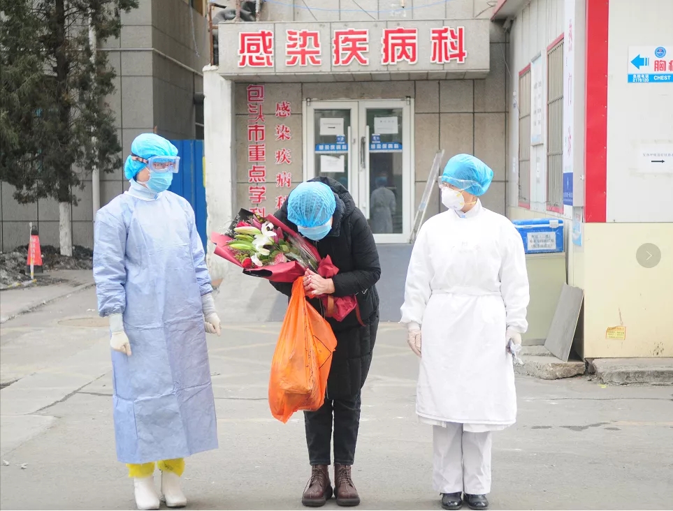 2月24日,包头市首例新冠肺炎重症患者从我院治愈出院。患者情绪激动,向医护人员鞠躬致谢。