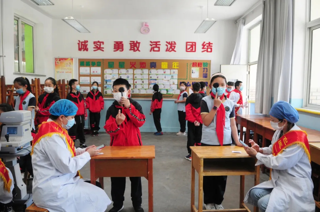 5月18日,学生复课后,为减少来院时的交叉感染风险,我院眼科医护人员走进钢三小等学校,为同学们检查视力,做好健康科普。