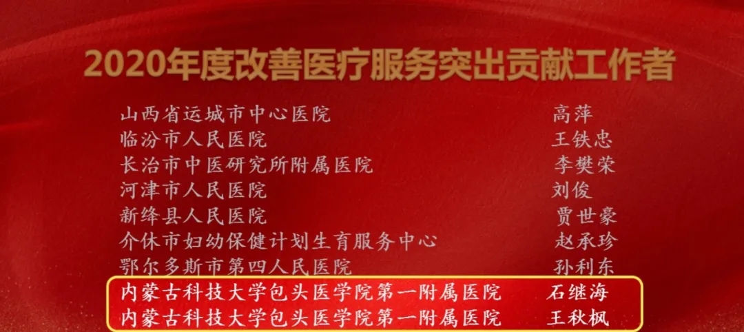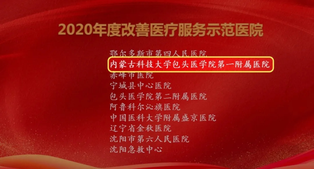 2020年是新二轮“改善医疗服务行动计划收官之年”。包医一附院全面落实全国卫生与健康大会精神,根据国家卫生计生委、国家中医药管理局相关文件精神,制定并印发了《包医一附院进一步改善医疗服务行动计划实施方案(2018-2020年度)》,紧紧围绕改善医疗服务加强制度建设和服务创新,获得社会各界和群众的广泛认同和赞誉,连续两年被评为“改善医疗服务示范医院”。