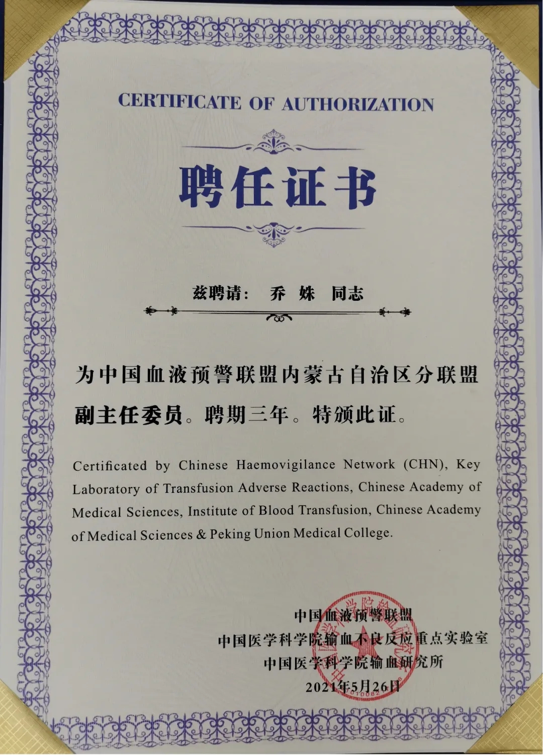 我院临床输血科学科带头人乔姝当选“中国输血不良反应联盟”(中国血液预警组织)内蒙古自治区分联盟中心副主任委员。