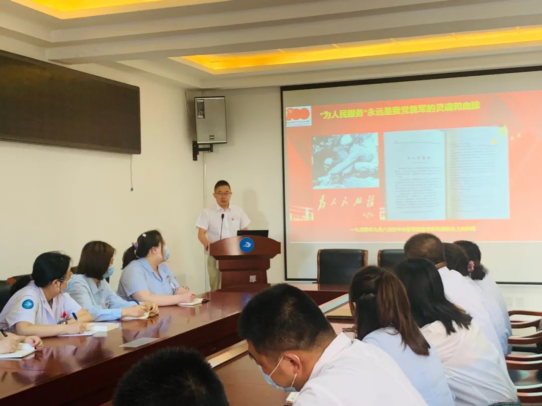 6月30日,党委委员、副院长裴汉军在办公楼一楼会议室为内科系统党支部的党员们讲授了题为《牢记党的宗旨,全心全意为人民服务》的专题党课,通过对党史的讲解,进一步阐述了坚守人民情怀,站稳人民立场,坚守医者初心和使命的深刻内涵。