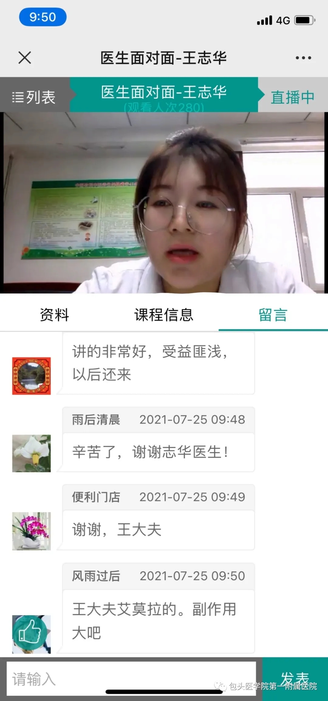 此次活动,使广大患者及家属不仅了解了类风湿关节炎的相关基础知识,还进一步学习了类风湿关节炎的治疗知识及康复知识;本次直播历史2小时,共吸引了290余位类风湿关节炎病友及家属在线收看,医患之间互动频繁,得到了广大患者的一致好评。