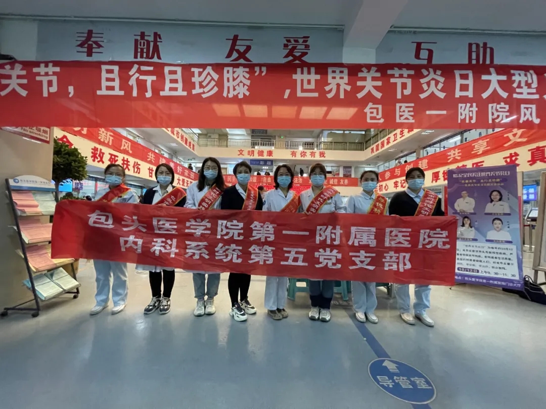 2021年10月12日,我院内科系统第五党支部所辖风湿免疫科的党员们在门诊大厅开展“关爱自己、且行且珍‘膝’”主题义诊活动。义诊现场,前来咨询的患者络绎不绝。医护人员通过询问病情、查看既往病历、现场触诊等方式为群众进行诊疗,耐心细致地解答患者疑问,宣传普及风湿病的防治知识及保健方法,帮助患者增强战胜疾病的信心和勇气。活动受到就诊群众的一致好评。