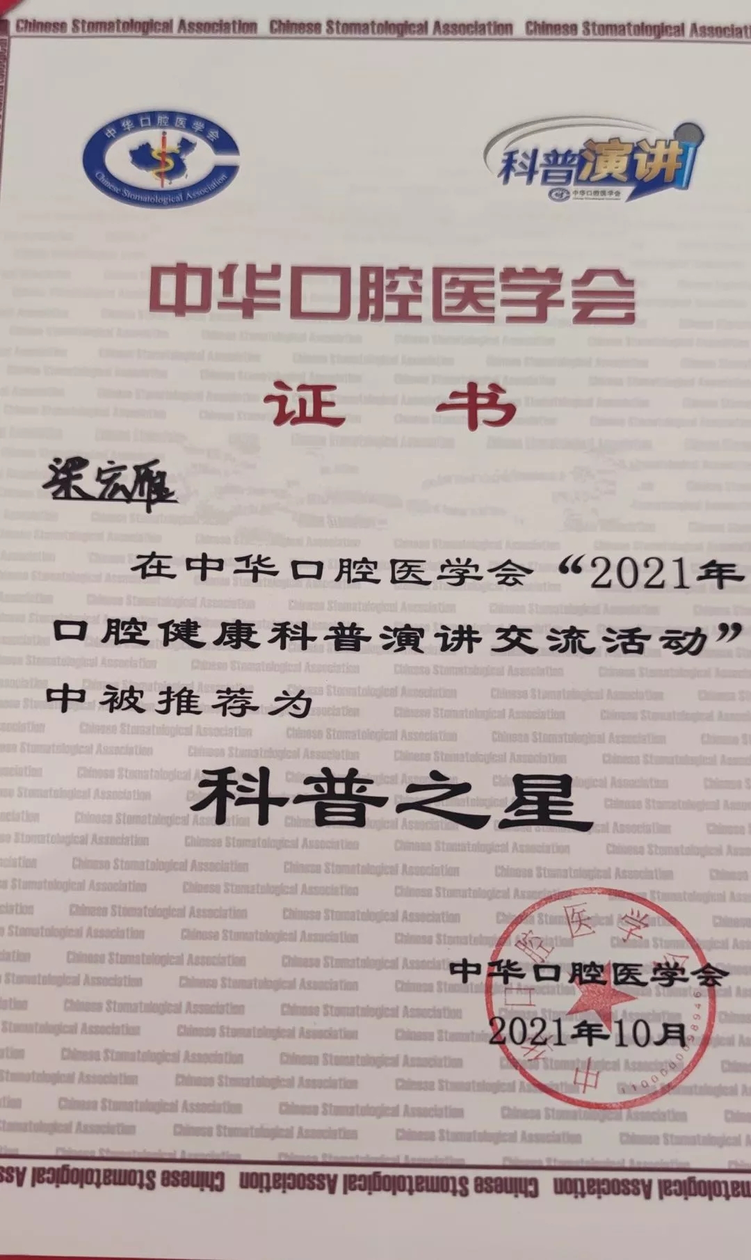 2021年10月20日,中华口腔医学会第23次全国口腔医学学术会议暨2021年全国口腔健康科普演讲交流会在上海国家会展中心召开,我院口腔科主治医师梁宏雁主讲的作品《窝沟保卫战》取得本次大赛最高奖项“科普之星”荣誉称号。