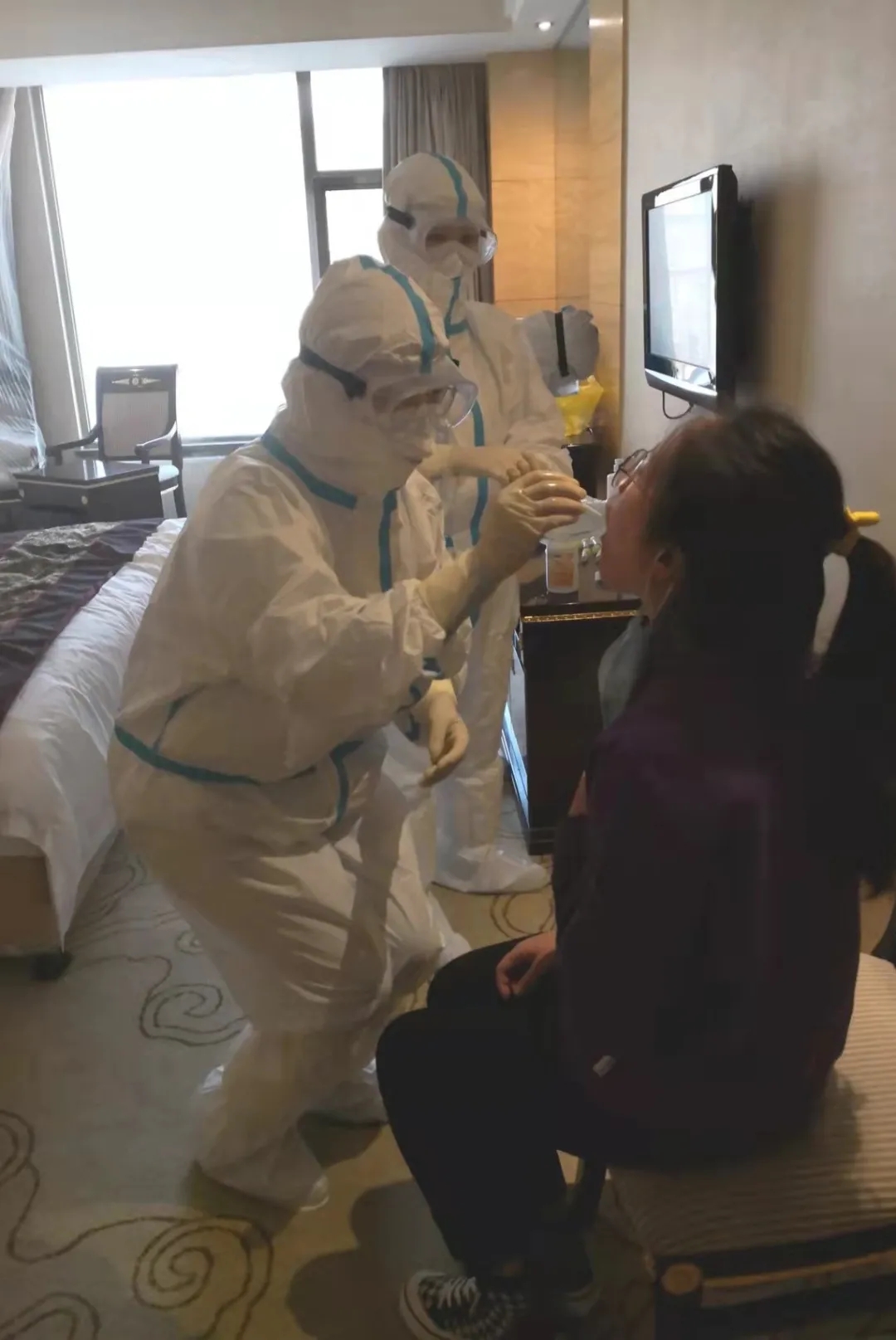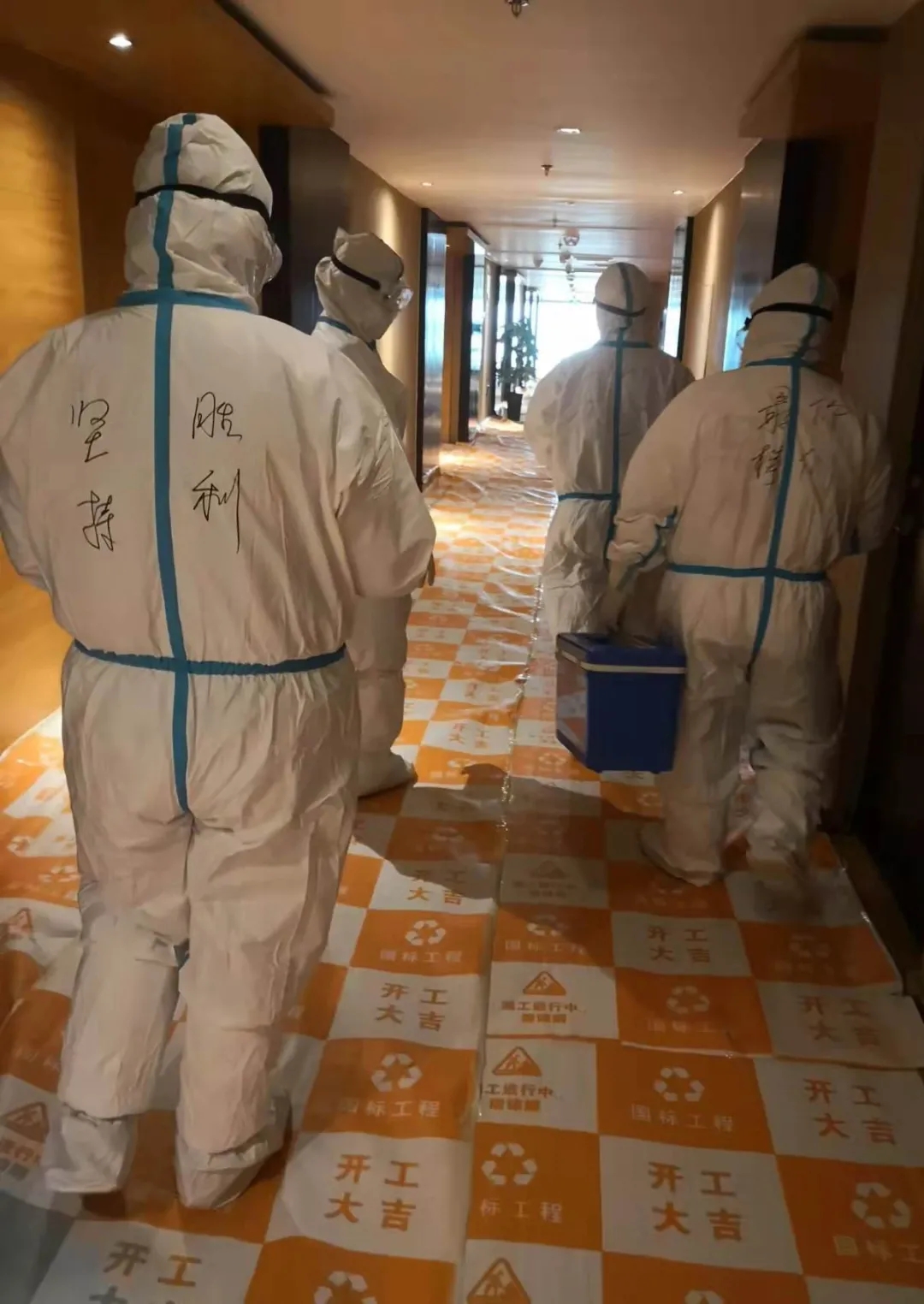 因为A座从8层楼开始到25层楼,每一层楼都住着客人;B座从2层至7层,同样每层都住着客人。尤其是B座没有电梯,大家都是拖着厚重的防护服爬楼梯进入客房去采样。有时采集核酸都要半蹲着身子,每次核酸采集完成脱了防护服,头发、内衣都是湿湿的,但是大家没有一点怨言。