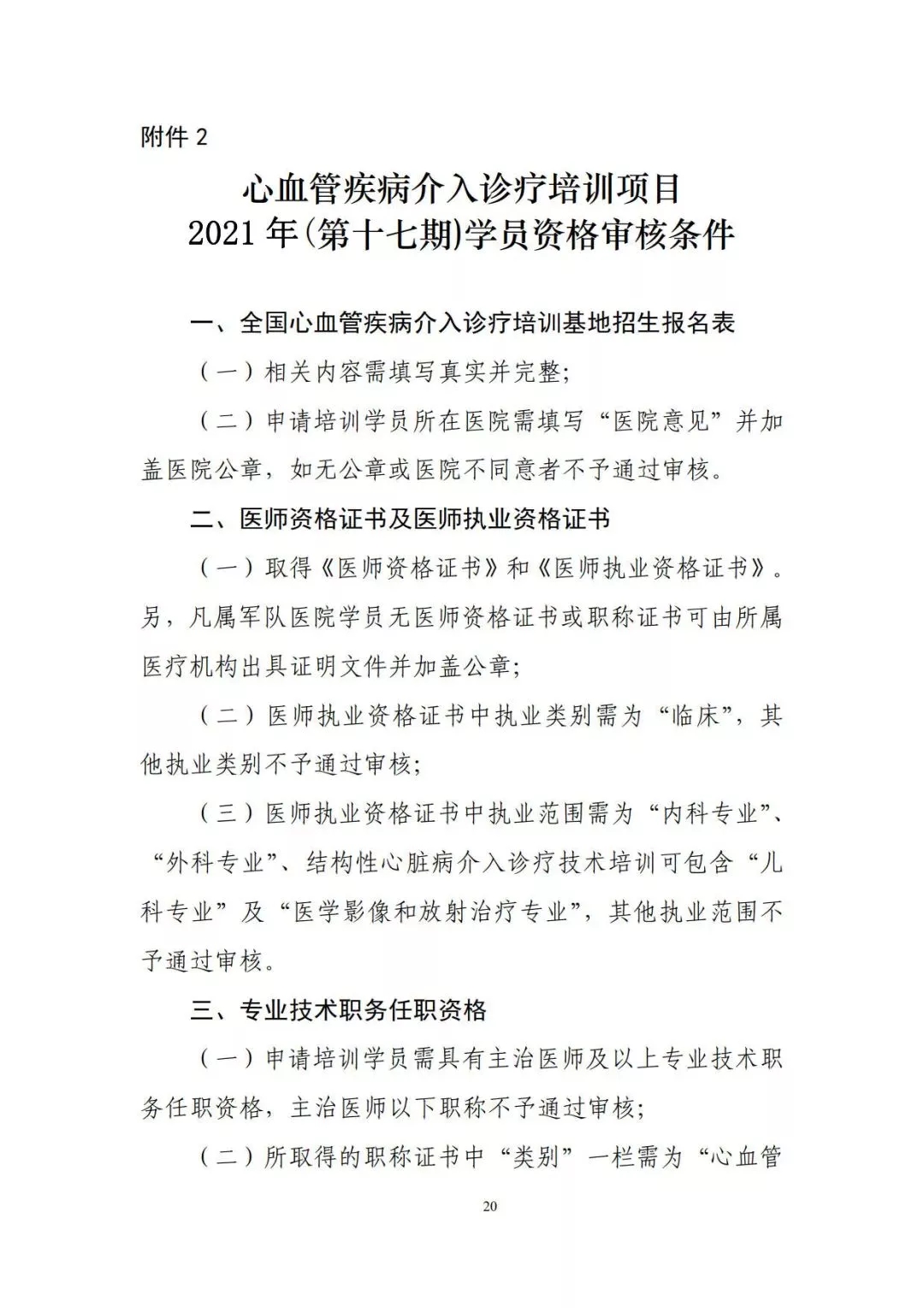 四、学员资质要求(一)取得《医师资格证书》和《医师执业证书》,且《医师执业证书》执业范围为内科专业或者外科专业,具有3年以上心血管疾病临床诊疗工作经验;(二)具有主治医师及以上专业技术职务任职资格;(三)经所属执业医院推荐;(四)已开展相关心血管疾病介入诊疗技术的县级医疗机构中,作为第一/二助手操作过相关技术的心内科医生。
