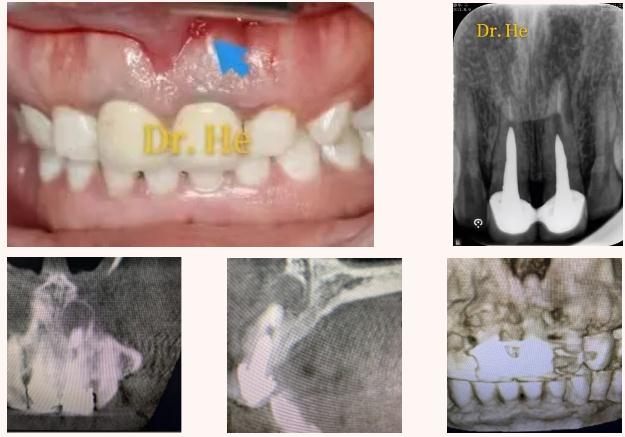 王女士3年前曾因牙痛在外院进行上前牙常规根管治疗,后采取桩核冠修复。近1年来,王女士左上前牙牙龈反复起脓包,经久不愈。辗转多家医院,有的建议取桩核冠进行根管再治疗,有的建议拔除进行种植。为寻求最佳的治疗方法,王女士到我院(包头医学院口腔医院)牙体牙髓科就诊。