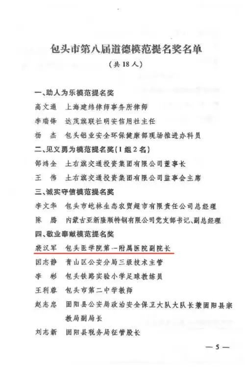 近日,包头市第八届道德模范及提名奖人选名单揭晓。我院副院长、心内科专家裴汉军荣膺包头市第八届道德模范敬业奉献模范提名奖。