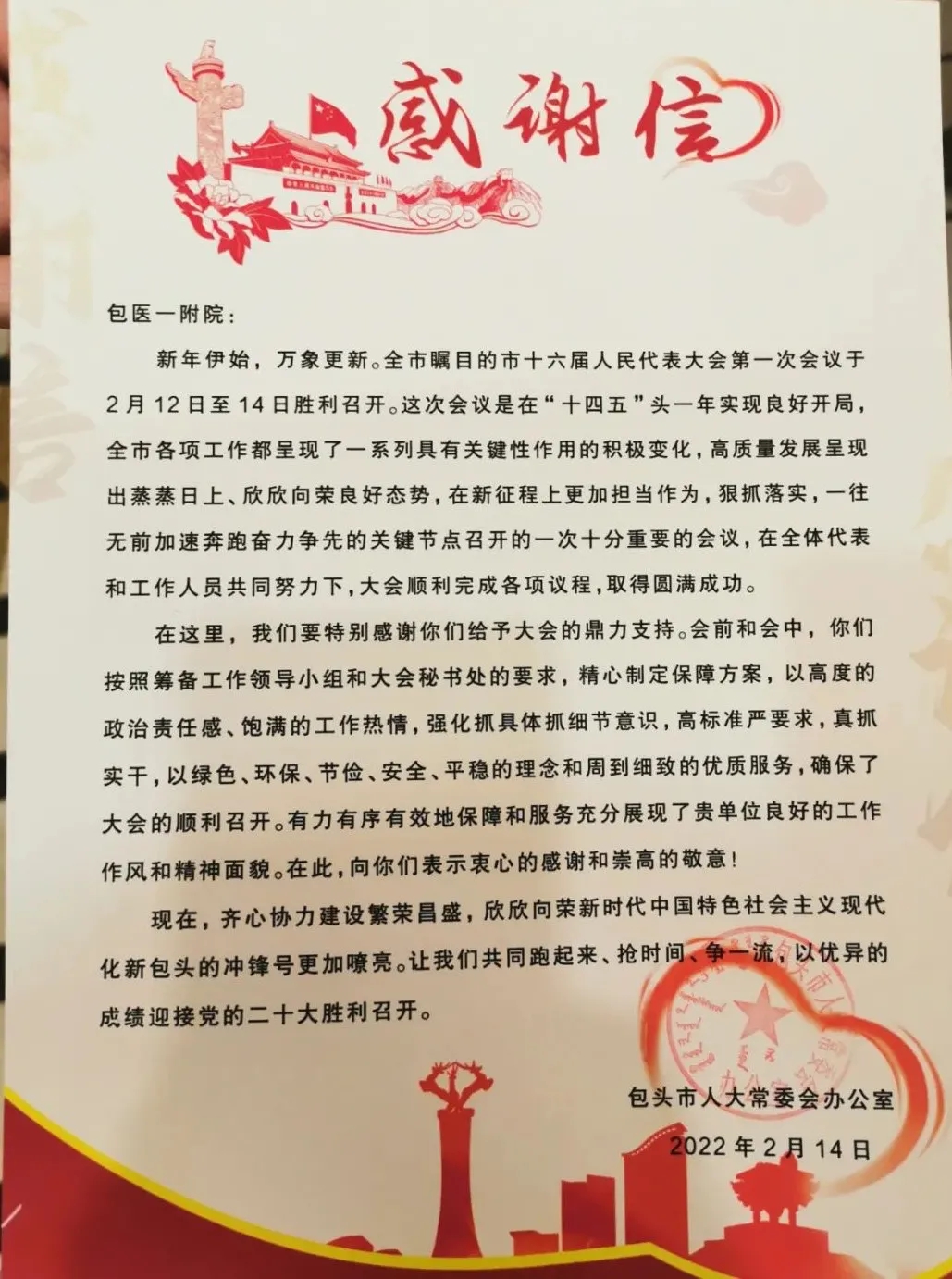 近日,我院收到来自包头市人大常委会办公室的感谢信,信中对我院讲政治、顾大局,以绿色、环保、节俭、安全、平稳的理念和周到细致的优质服务确保了大会的顺利召开表示衷心感谢。