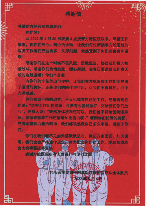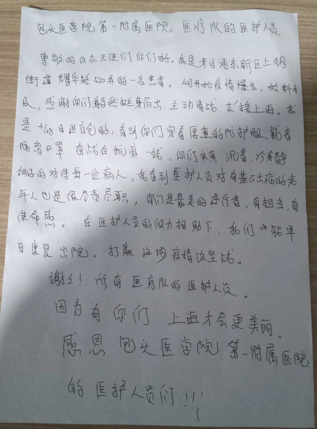 当看到感谢信中写道,“因为有你们,上海才会更美丽,感恩包头医学院第一附属医院的医护人员们”,不禁泪盈于睫。一封封感谢信,代表患者的认可,更是最暖的肯定。