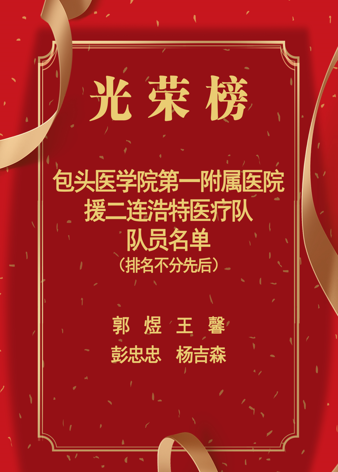 在二连浩特市新冠肺炎疫情发生后,我院杨吉森、彭忠忠、王馨、郭煜4名医护人员坚决响应号召,肩负责任和使命,带着感情和热情,白衣执甲,逆行出征奔赴二连浩特市同新冠病毒面对面较量,圆满出色地完成了核酸检测任务,把医务人员“敬佑生命、救死扶伤、甘于奉献、大爱无疆”的好品质、好作风、好形象、好口碑留在了抗疫一线。