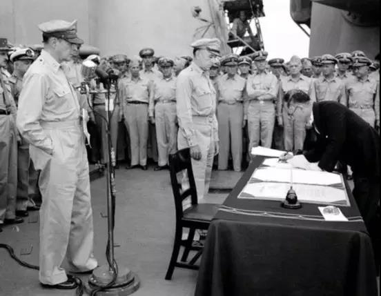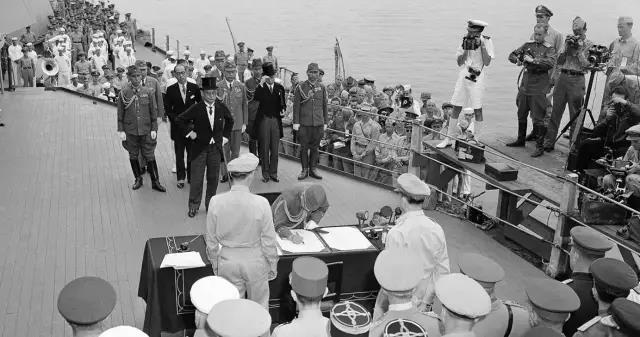 日本代表登上美军“密苏里号”军舰,