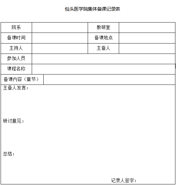 (5)集体备课记录:要完整、详实,整理记录和原始记录要存档。内容包括:集体备课时间、地点、备课科目、主持人、参加人员、主备课教师、备课内容 (章节)、学时等。
