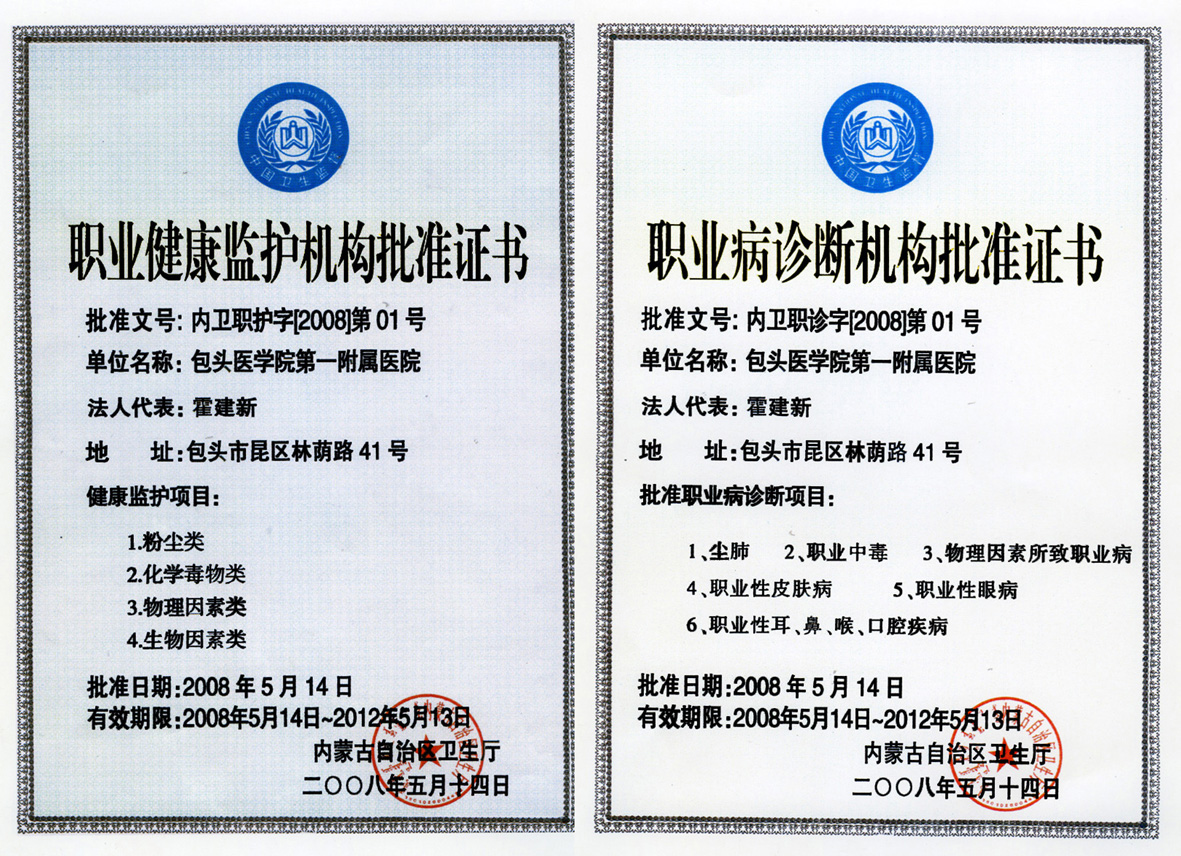 包头医学院第一附属医院职业病科成立于2008年3月,同年5月取得了内蒙古自治区卫生厅颁发的职业健康监护和职业病诊断资格证书。属于临床一级学科。