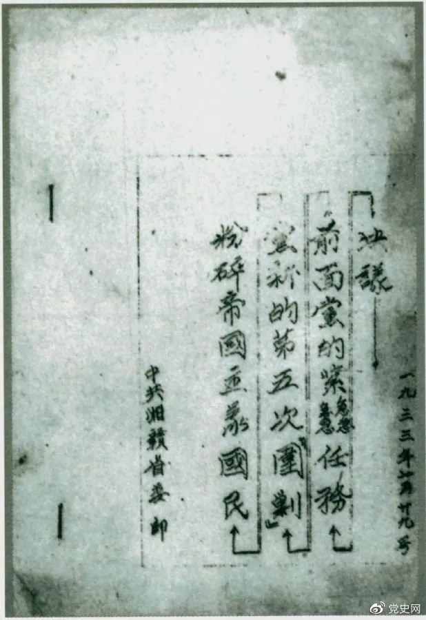1933年7月29日,任弼时主持中共湘赣省委作出的《粉碎帝国主义国民党新的第五次“围剿”前面党的紧急任务决议》。